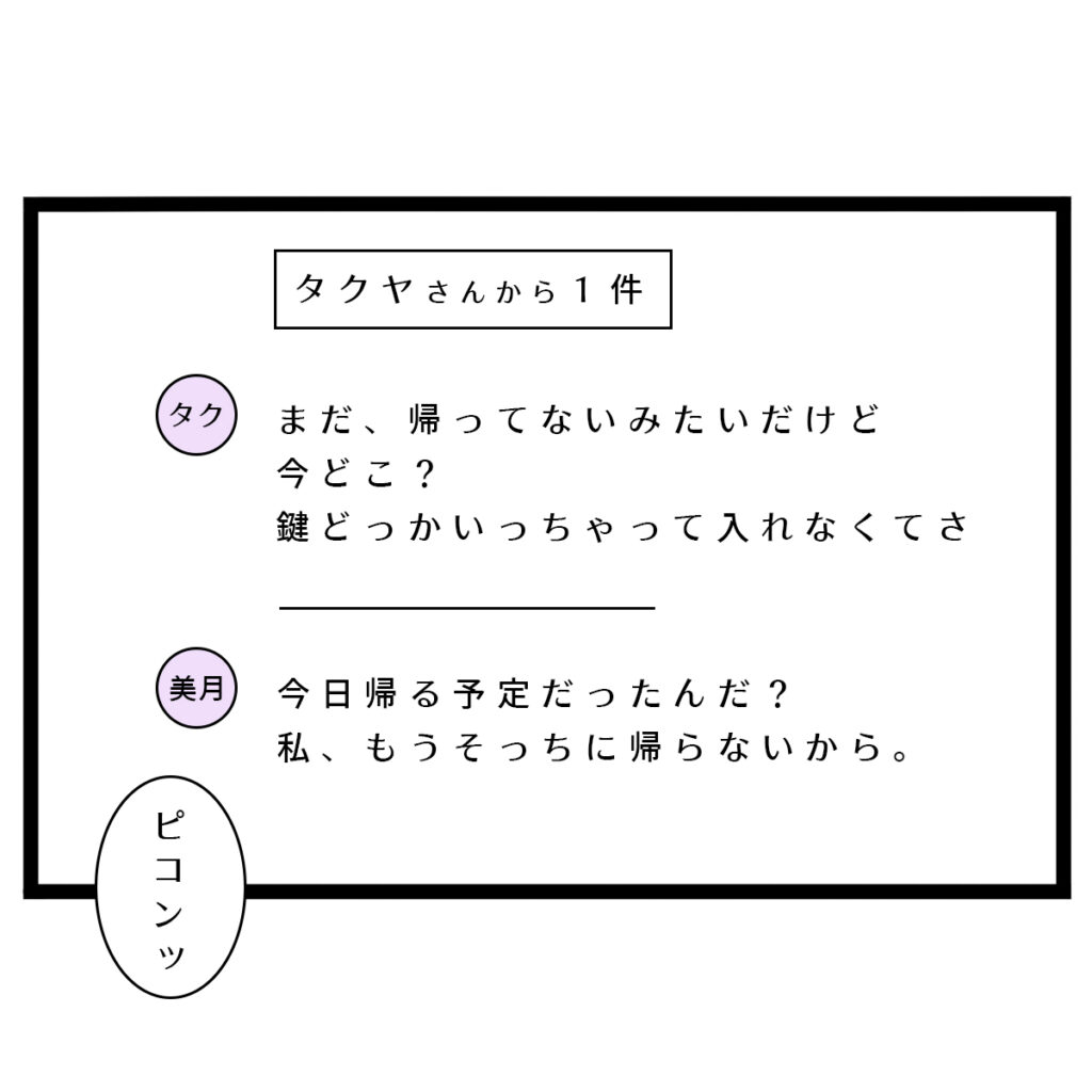 「まだ帰ってないみたいだけど今どこ?鍵どっかいっちゃって入れなくてさ」というタクヤからのメッセージでした。私は「今日帰る予定だったんだ?私、もうそっちに帰らないから」と返信。