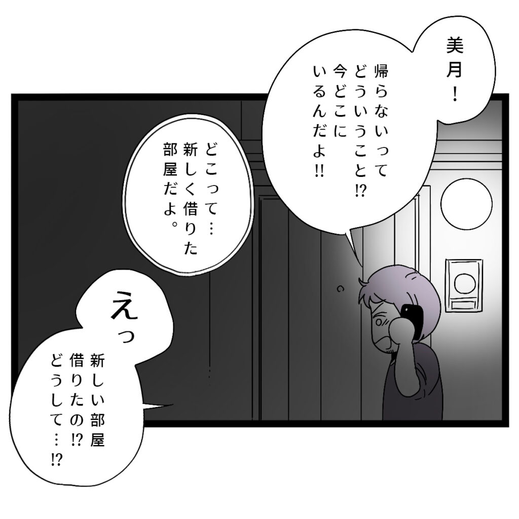 「美月!帰らないってどういうこと!?今どこにいるんだよ!!」と苛立った様子のタクヤ。私は落ち着いて「どこって・・新しく借りた部屋だよ」と答えると、タクヤは「えっ!新しい部屋借りたの!?どうして・・!?」と動揺し始めました。