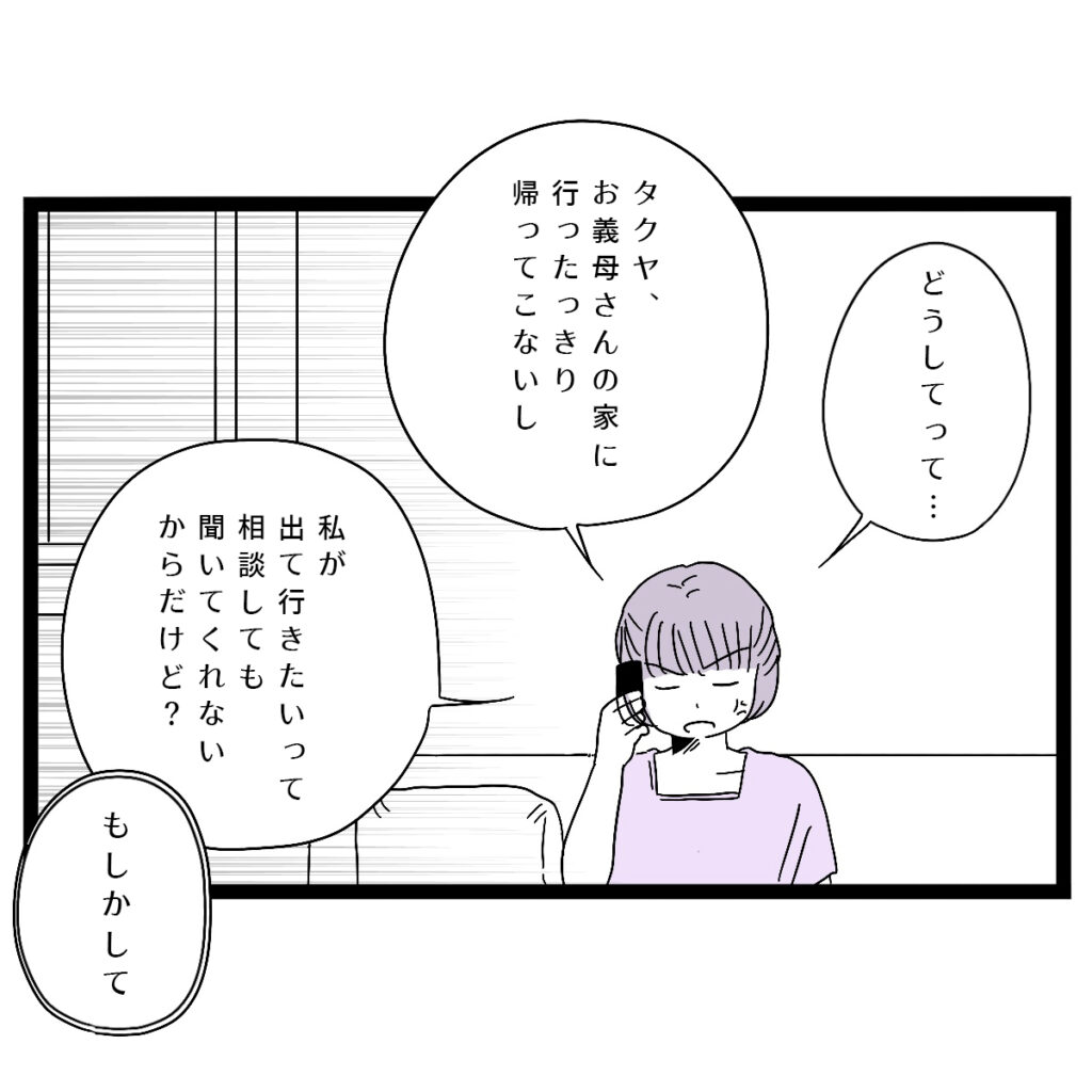 私は怒りを抑えながら「どうしてって・・タクヤ、お義母さんの家に行ったっきり帰ってこないし、私が出て行きたいって相談しても聞いてくれないからだけど?」と淡々と答えました。すると、「もしかして」