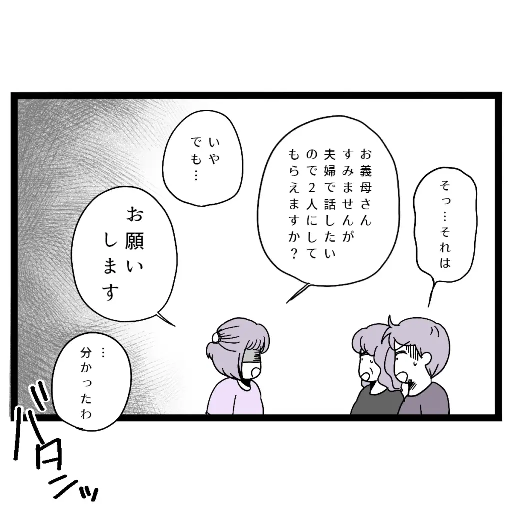 「そっ・・それは」と動揺するタクヤを放置して、「お義母さん、すみませんが夫婦で話したいので2人にしてもらえますか?」と義母にたずねると、「いや、でも・・」と答える義母に、「お願いします」と強めの口調で依頼。義母は観念したのか「・・分かったわ」と言い、部屋を出て行きました。