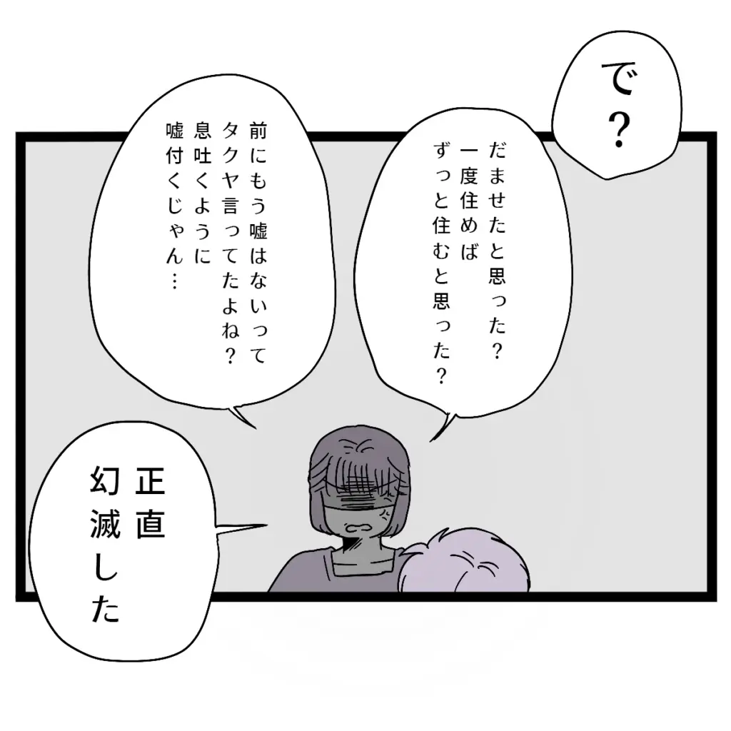 「で?だませたと思った?一度住めばずっと住むと思った?前にもう嘘はないってタクヤ言ってたよね?息吐くように嘘つくじゃん・・正直幻滅した」と怒りながら言うと、