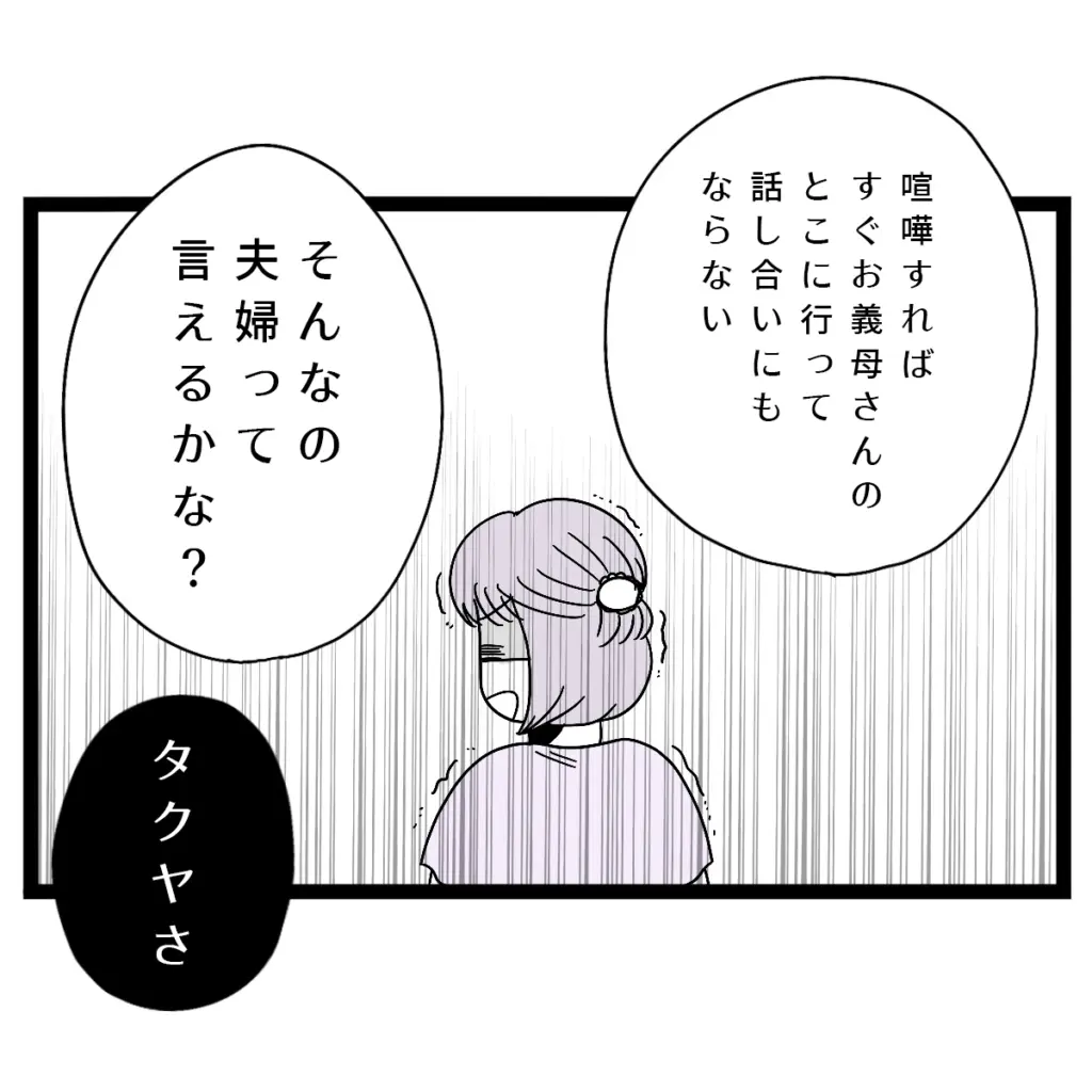 「喧嘩すればすぐお義母さんのとこに行って話し合いにもならない。そんなの夫婦って言えるかな?」言えば言うほど怒りがこみ上げ、震えているのを感じていた私は、「タクヤさ、」とタクヤに声をかけると、