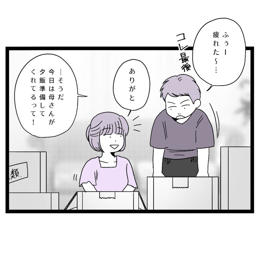 そして時は過ぎ、ついに引っ越し当日。荷物の搬入を終えて片付けをしていると、タクヤが思い出したように「・・・そうだ、今日は母さんが夕飯準備してくれてるって!」と言いました。