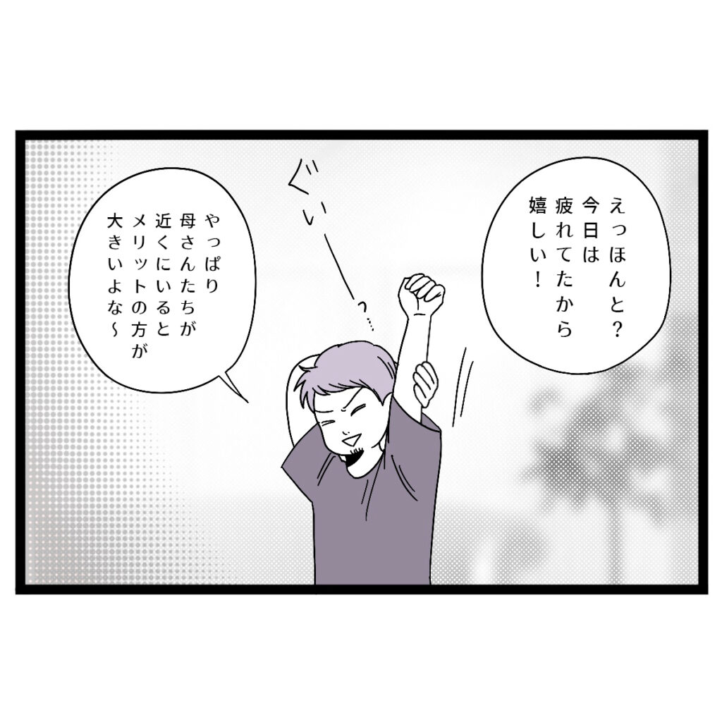 「えっほんと?今日は疲れてたから嬉しい!」引っ越し作業でヘトヘトだった私は、義母が夕飯を作ってくれていると聞いて、ありがたさが身にしみました。タクヤは大きく伸びをしながら、「やっぱり母さんたちが近くにいると、メリットの方が大きいよな~」と言いました。