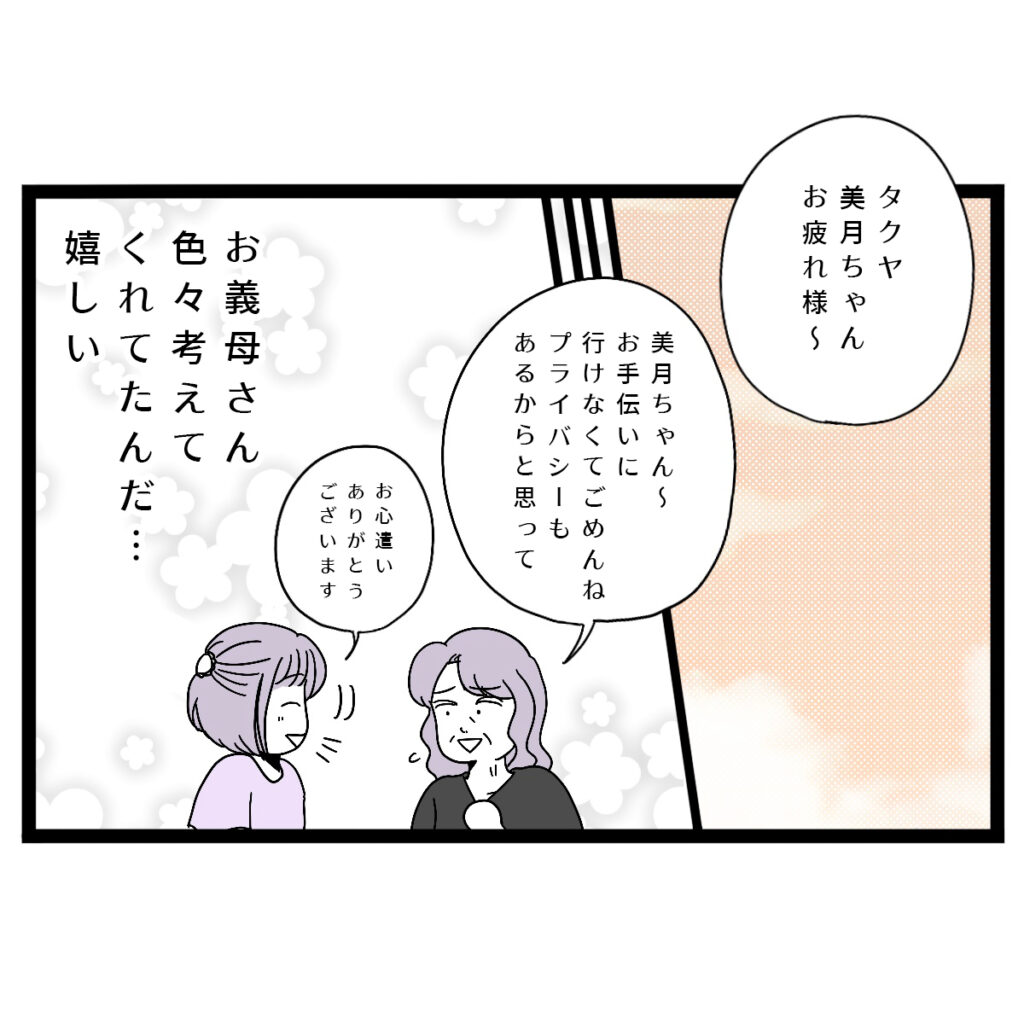 しばらくして、義母が家にやってきました。「美月ちゃん~お手伝いに行けなくてごめんね、プライバシーもあるからと思って」私たちを気遣って色々考えてくれてたんだ・・・義母の細やかな心遣いに、胸がじんわりと温まります。