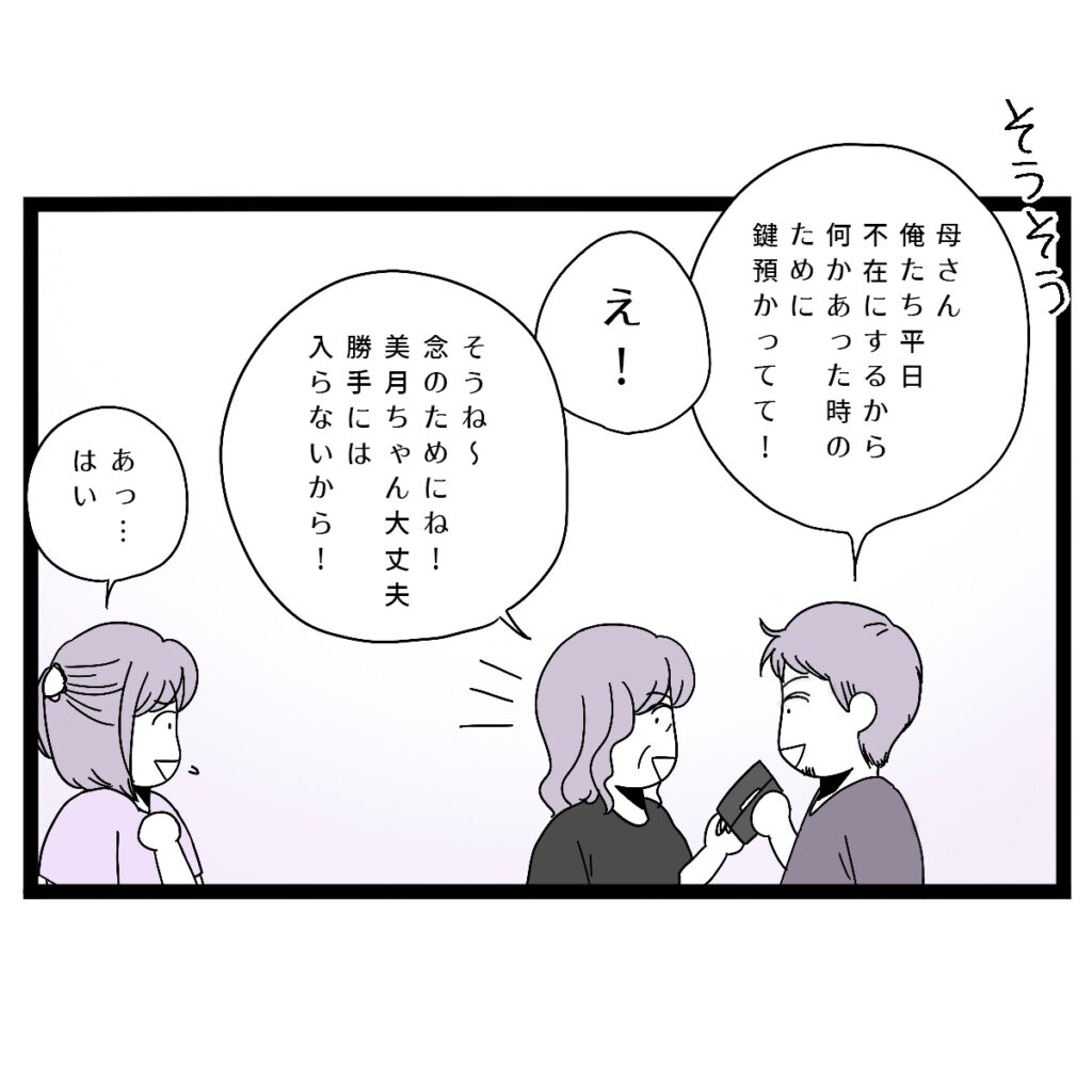 するとタクヤが「母さん、俺たち平日不在にするから、何かあった時のために鍵預かってて!」と、義母に合鍵を渡しました。突然のことに私は「え!」と驚きましたが、義母は気にする様子もなく「念のためにね!美月ちゃん大丈夫、勝手には入らないから!」と鍵を受け取りました。