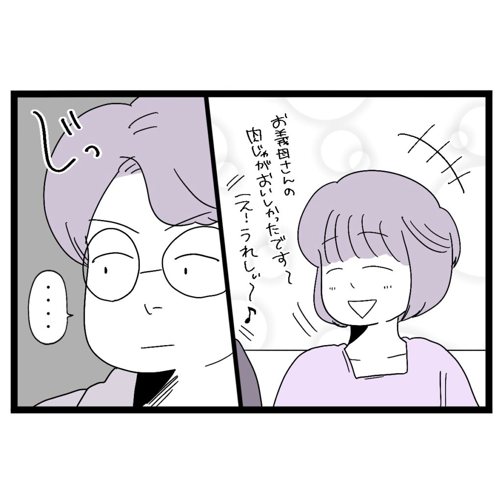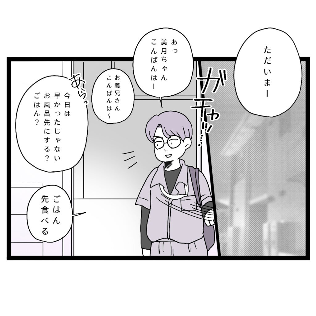 義実家で夕飯を食べてゆっくりしていると、カズヤさんが仕事から帰ってきました。カズヤさんの帰宅に気付いた義母は、「あらっ今日は早かったじゃない、お風呂先にする?ごはん?」と声をかけます。カズヤさんは少し考えて「ごはん先食べる」と答えました。
