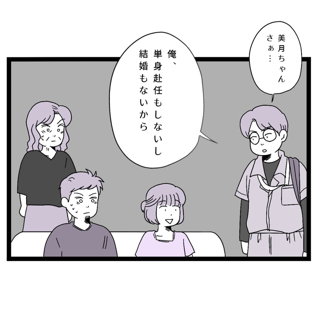 時は過ぎ、ついに引っ越し当日。荷物の搬入と片付けを終えた頃、義母が様子を見に来てくれました。するとタクヤさんは突然、「何かあった時のために鍵預かってて」と義母に合鍵を渡します。驚く美月さんでしたが、義母の「勝手には入らないから!」という言葉を信じ、ひとまず受け入れました。その後、義実家で夕飯をご馳走になりながらくつろいでいると、カズヤさんが仕事から帰ってきました。そして美月さんの顔をじっと見つめたかと思うと、突然「美月ちゃん、俺、単身赴任もしないし結婚もないから」と言いました。思いがけない言葉に、美月さんは頭の整理がつかず、その場で固まってしまいました。はじめに義母から聞いていた話と違いますね。タクヤさんも何か隠していそうです。