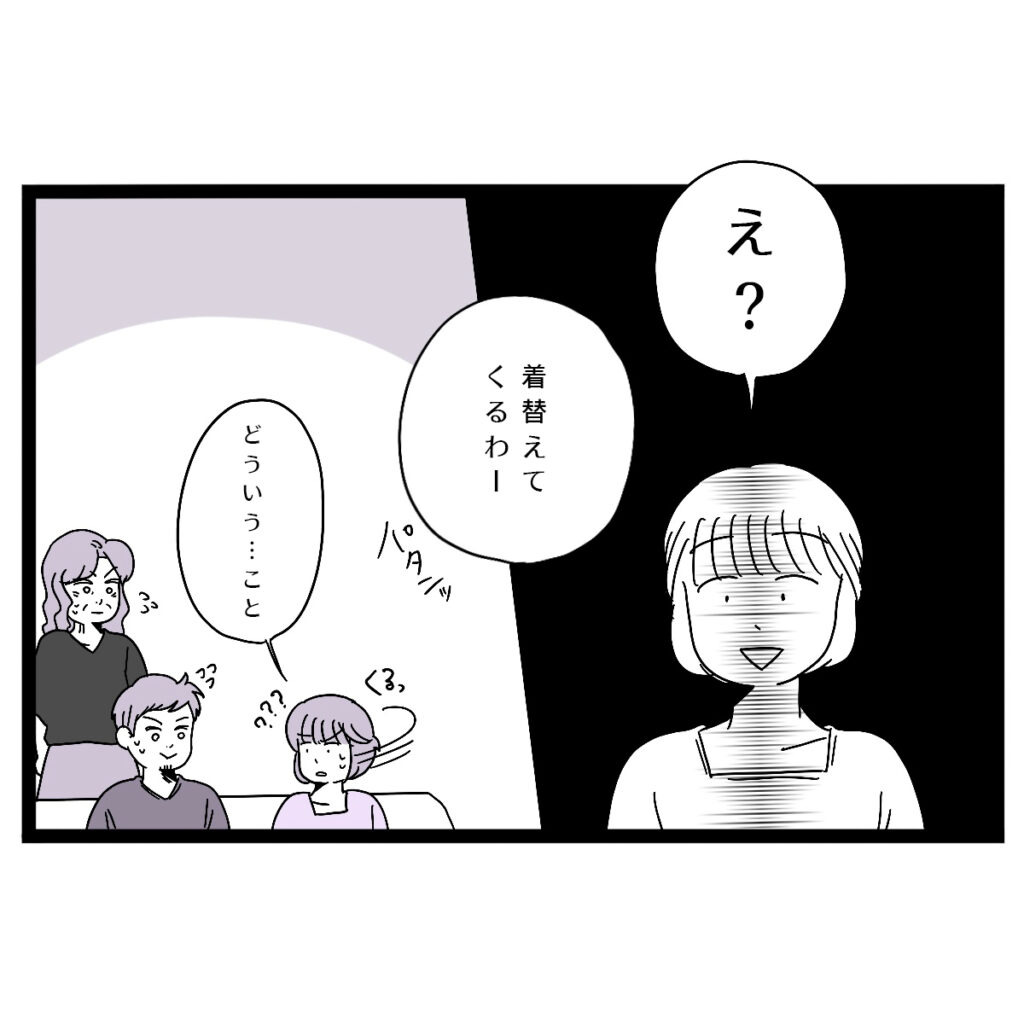 単身赴任もしないし結婚もない・・・?頭の整理がつかず、「え?」としか声を出せません。カズヤさんが「着替えてくるわー」と部屋を出たところでようやく我に返り、義母とタクヤに向き直って「どういう・・・こと?」問いかけました。