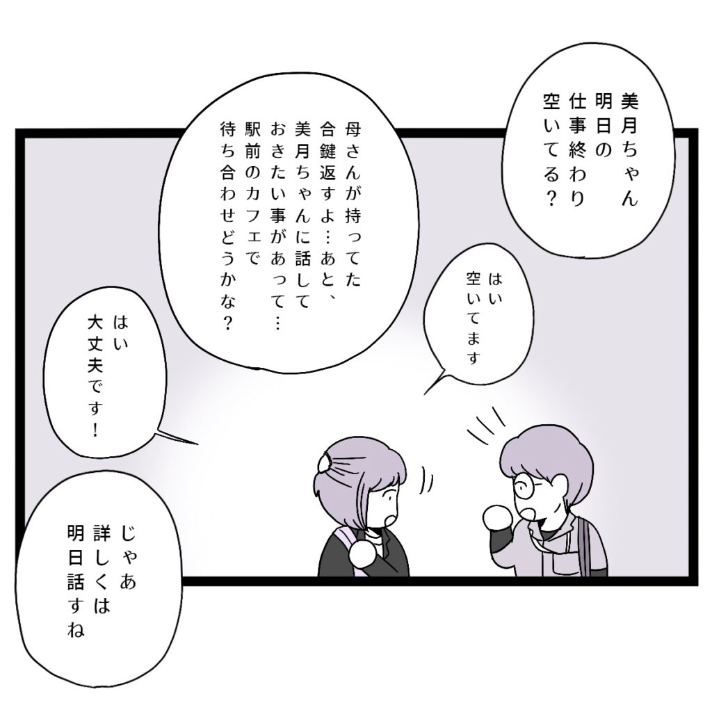 「美月ちゃん、明日の仕事終わり空いてる?」とたずねられ、「はい。空いてます」と答えると、「母さんが持ってた合鍵返すよ・・あと、美月ちゃんに話しておきたい事があって・・駅前のカフェで待ち合わせどうかな?」お義兄さんの言葉に「はい大丈夫です!」と即答すると、「じゃあ、詳しくは明日話すね」と言いました。