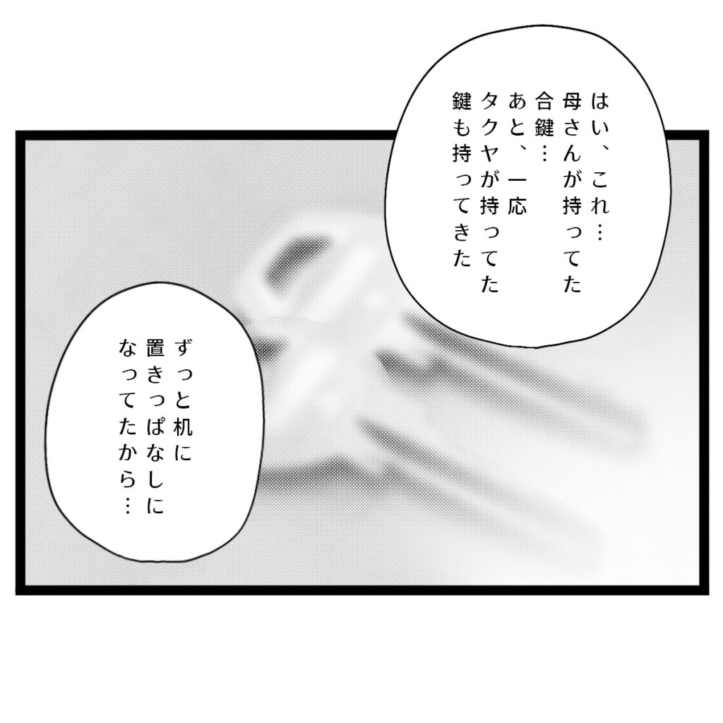 そして、「はい、これ・・母さんが持ってた合鍵・・あと、一応タクヤが持ってた鍵も持ってきた。ずっと机に置きっぱなしになってたから・・」と合鍵を差し出すお義兄さん。