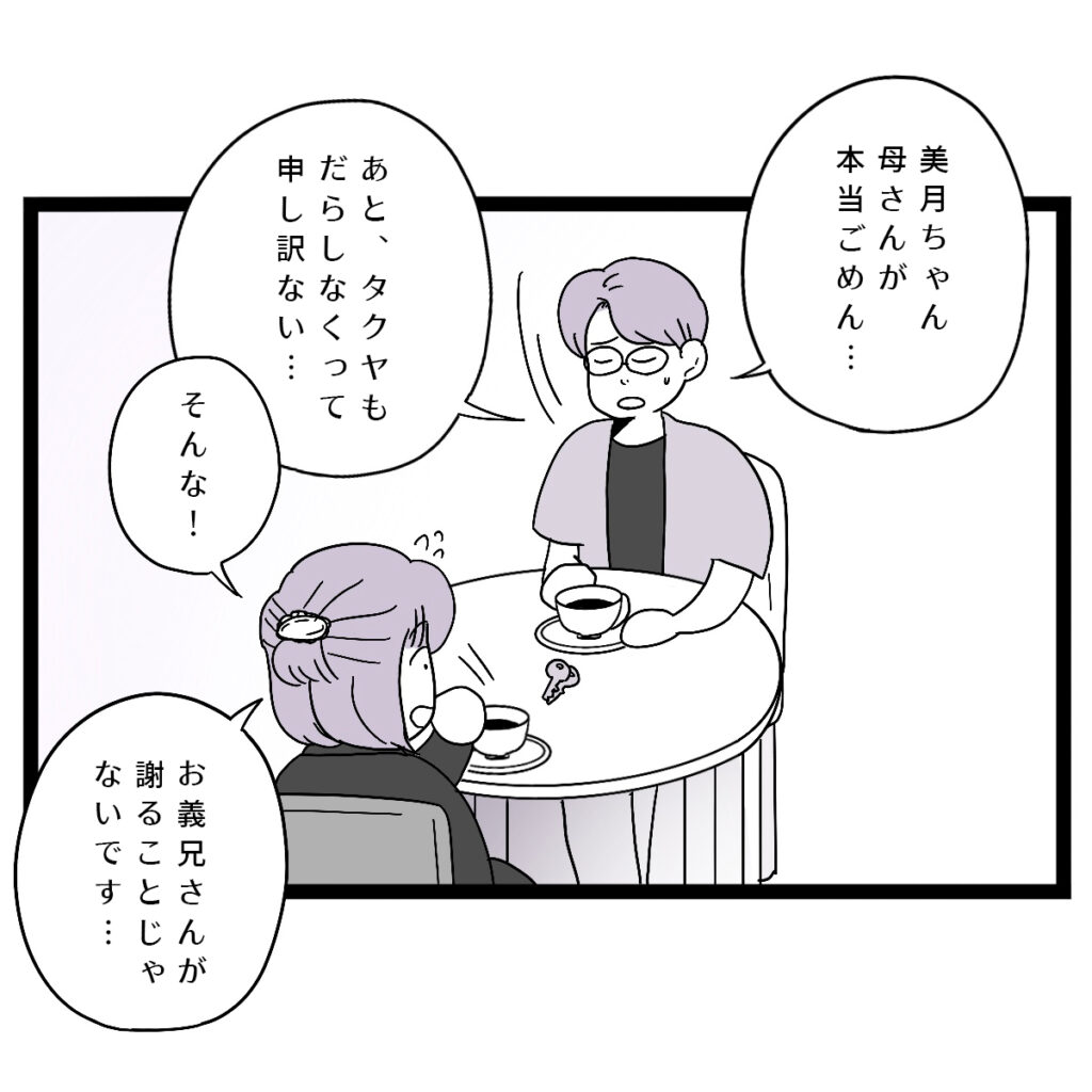 すると、「美月ちゃん、母さんが本当ごめん・・あと、タクヤもだらしなくって申し訳ない!」平謝りするお義兄さん。「そんな!お義兄さんが謝ることじゃないです・・」と言った後、