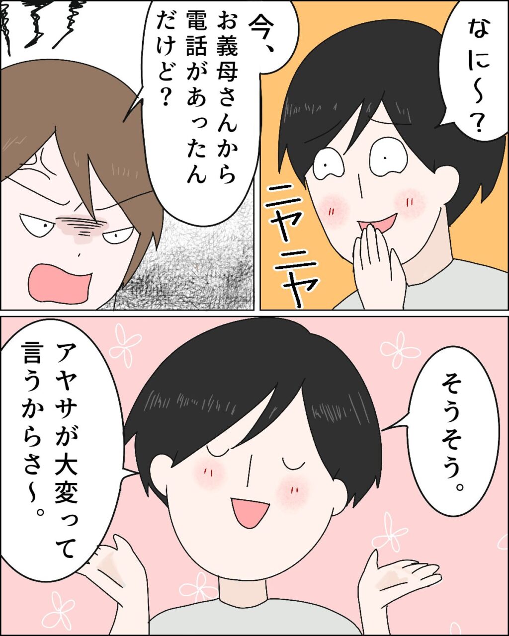 2歳のチアキくん、0歳のナツキくん最優先でお世話を頑張っている現在育休取得中のアヤサさん。でも夫ユキヒロさんは、子どもたちではなく自分を優先して1番に考えて欲しいとアヤサさんに訴えます。ユキヒロさんの実家ではいつも父親が一番偉いとされていて、何をするにも父親優先の家庭だったので、ユキヒロさんはずっと我慢していました。結婚したら父親のような扱いをしてもらえると勝手に思っていたユキヒロさんは、現在子どもが優先になっていて不公平だと言うのです。子ども優先の生活を変える気が無いアヤサさんとの意見は平行線なことが分かったユキヒロさんは、「アヤサが子育てが大変だから手伝いに来て」と母親を呼び、しばらく滞在してもらうようにしてしまいました。突然義母が来ることになったアヤサさんは、当然心穏やかではありません。