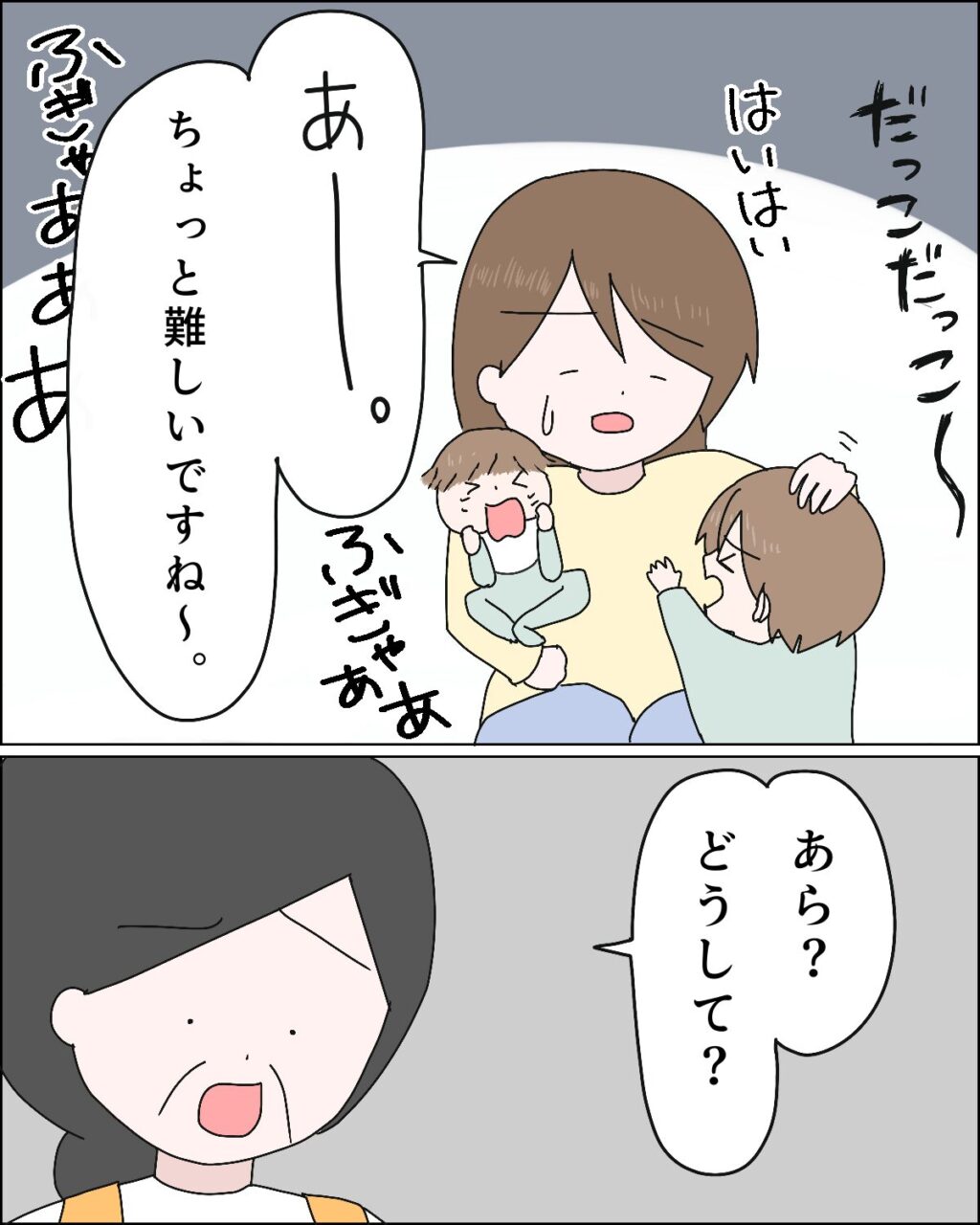 「あー。ちょっと難しいですね。」とハッキリ答えた私。そうしている時にも、泣き止まないナツキをあやし、抱っこをせがむチアキの相手をしなければいけません。玄関までユキヒロを見送れない私に不満そうに理由を聞いた義母に