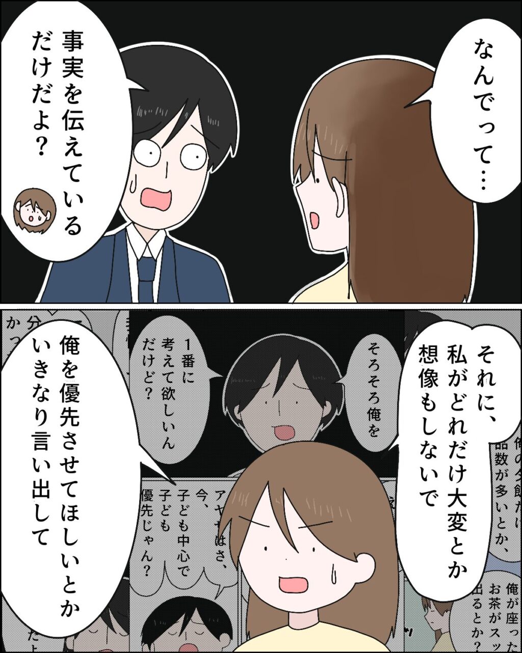 ユキヒロさんは子どもの頃、いつもお父さんが最優先されて我慢ばかりしていたことがよほど嫌だったようですね。自分のことを全く気づかってくれず、父親であり夫である自覚がないユキヒロさんを大切に思えないアヤサさんの気持ちが伝わりますね。