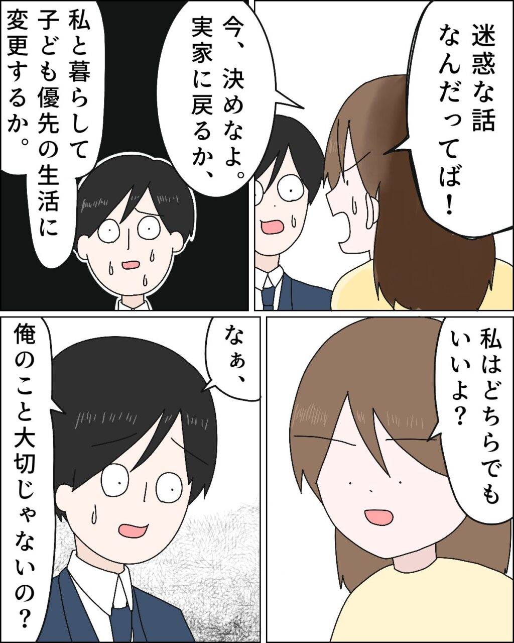 「迷惑なんだってば!今、決めなよ。実家に戻るか、私と暮らして子ども優先の生活に変更するか。私はどちらでもいいよ?」本当に、義母と一緒に実家に戻っても私として楽になる事はあっても困ることは無いと断言できました。するとユキヒロは「なぁ、俺のこと大切じゃないの?」と心配そうに聞きました。