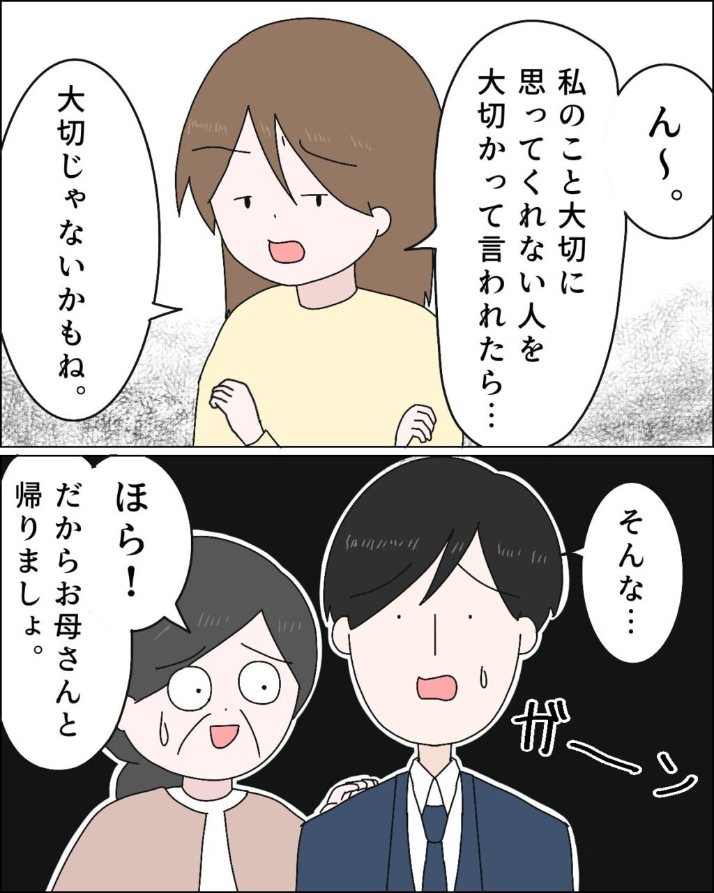 「私のこと大切に思ってくれない人を大切かって言われたら・・・大切じゃないかもね。」この際なので、義母の聞いているところでハッキリと伝えました。「そんな・・・」と言葉を失うほどショックな夫のそばで、「ほら!だからお母さんと帰りましょ。」ともう一度義母がユキヒロを誘いました。
