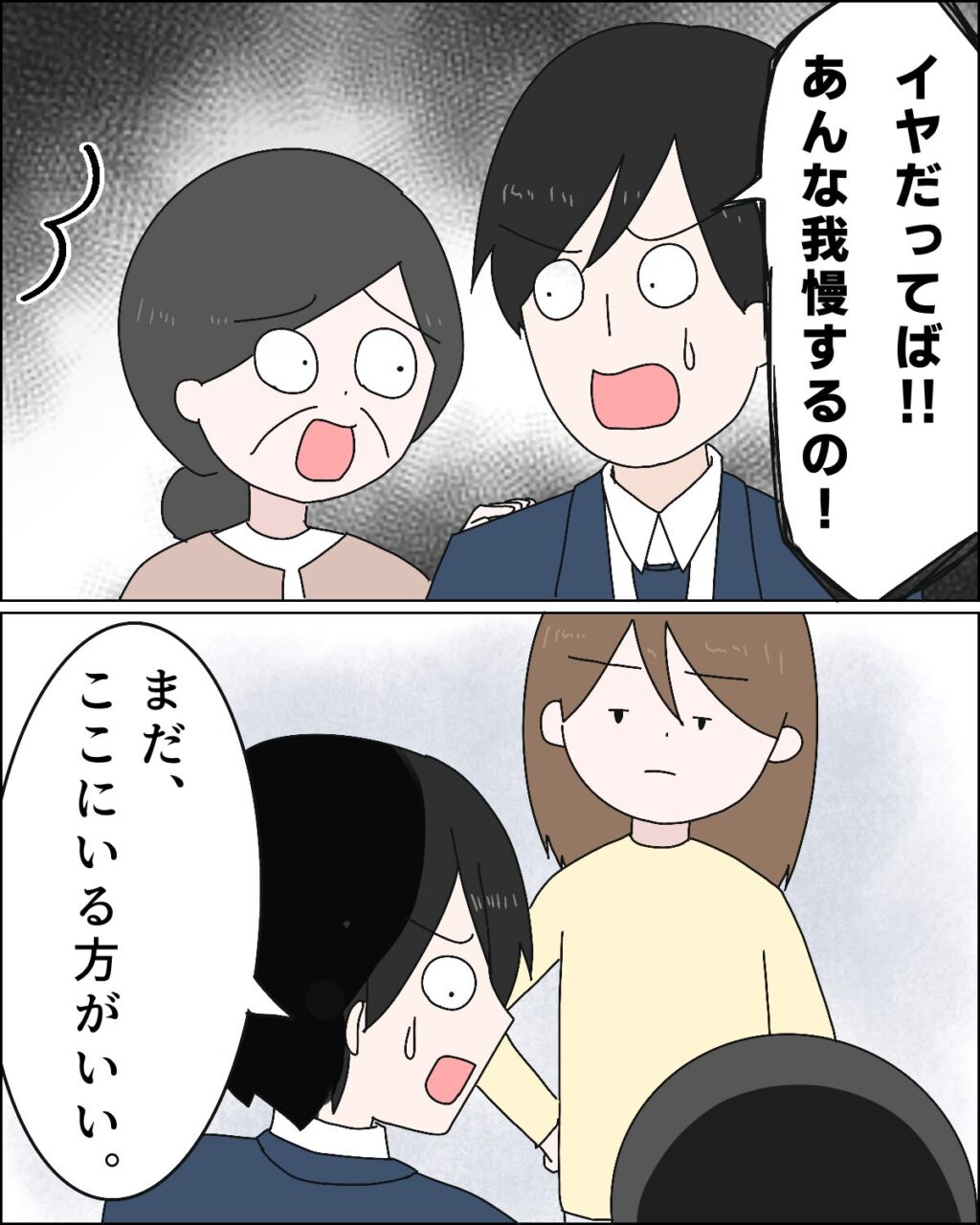 「イヤだってば!あんな我慢するの!」と、実家に帰るという選択肢はなさそうな夫。「まだ、ここにいる方がいい。」と義母に伝えました。