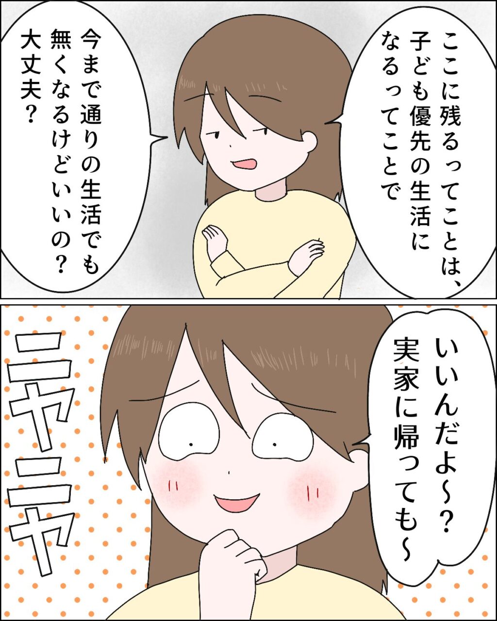 私のターン。「ここに残るってことは、子ども優先の生活になるってことで、今まで通りの生活でもなくなるけどいいの?大丈夫?いいんだよ~?実家に帰っても~。」ニヤニヤしながら夫の決断を待ちました。