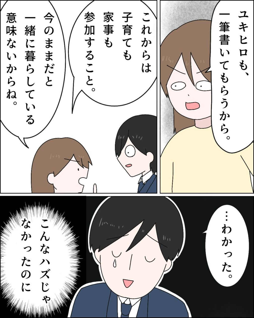 さらに、「ユキヒロも、一筆書いてもらうから。これからは、子育ても家事も参加すること。今のままだと一緒に暮らしている意味ないからね」と言うと、「・・わかった」と言いつつ、こんなハズじゃなかったのにと言わんばかりに涙ぐむ夫。