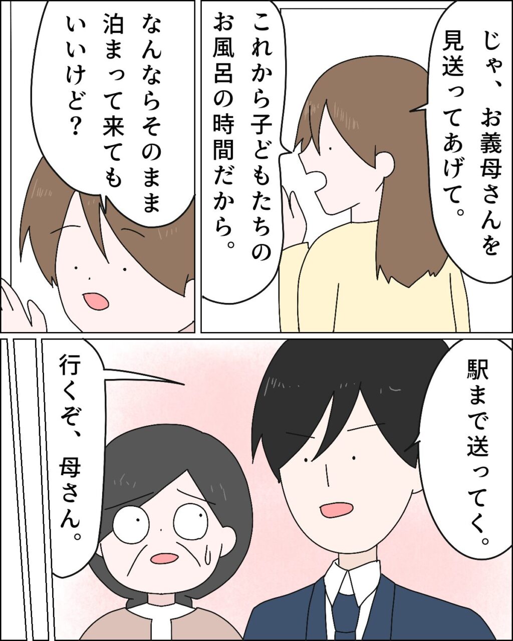 そして、「じゃ、お義母さんを見送ってあげて。これから子どもたちのお風呂の時間だから」そう言った後、「なんならそのまま泊まって来てもいいけど?」と言うと、「駅まで送ってく。行くぞ、母さん」そうキッパリ言い切った夫を見て、義母は驚いているようでした。