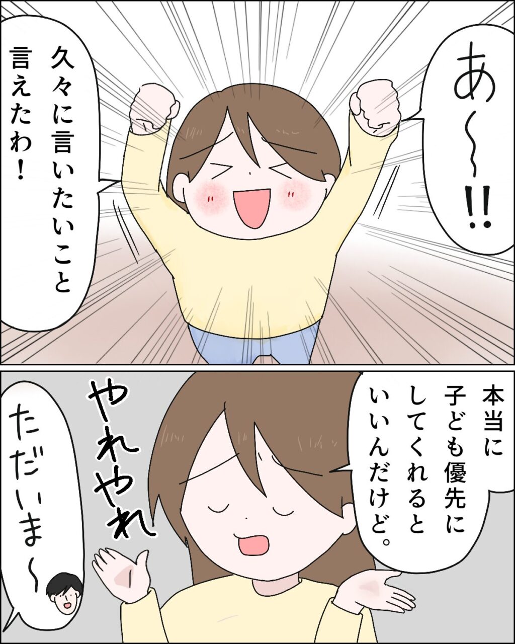 二人が家を出た後、「あ~!!久々に言いたいこと言えたわ!」とうれしくなり思わず両手を上げる私。「本当に子ども優先にしてくれるといいんだけど。」やれやれと思いながらそう呟いていると、「ただいま~」と夫が帰ってきました。