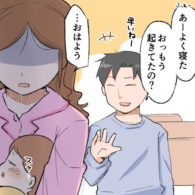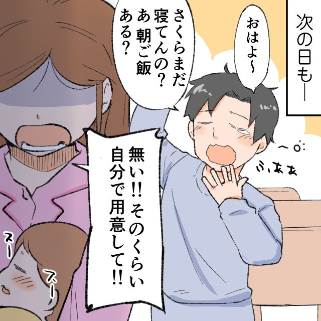 その日の夜も、さくらは驚くほどぐっすり眠っていました。新生児の夜泣きは大変だと聞いていたけれど、意外とそうでもないのかも。パパとママを起こさず寝てくれる、なんていい娘なんだろうと感心していました。翌朝目を覚ますと、またしてもゆきのはすでに起きていました。「おはよ~さくらまだ寝てんの?朝ご飯ある?」そう聞くと、ゆきのは「無い!そのくらい自分で用意して!」と突然声を荒げました。