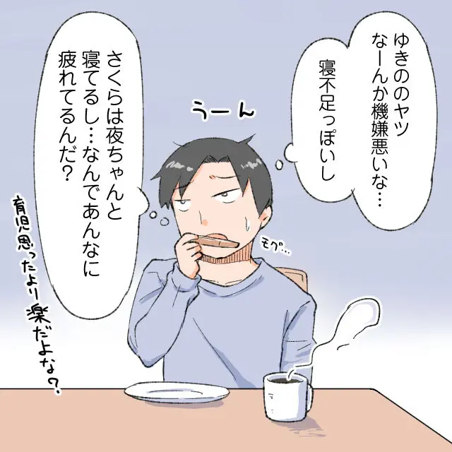 ゆきののヤツ、なんだかやけに機嫌が悪い。寝不足みたいにも見えるけど、さくらは夜ちゃんと寝てるし、なんであんなに疲れているんだろう。育児って思ったより楽だと思ったんだけど・・・。俺にはゆきのがなぜあんなに機嫌が悪いのか、見当もつきませんでした。