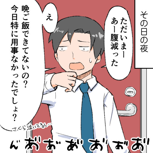 その日の夜。仕事を終えて腹ペコのまま帰宅すると、ゆきのから「晩ご飯の用意ができていない」と聞かされます。1日働いてきてお腹も限界だった俺は、思わず「え、晩ご飯できてないの?今日特に用事なかったでしょ?」と聞いてしまいました。