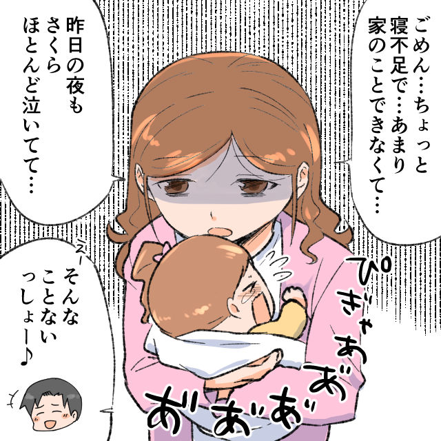 すると、ゆきのはやつれた表情で「ごめん、ちょっと寝不足であまり家のことできてなくて・・・昨日の夜もさくらほとんど泣いてて・・・」と言いました。夜通し泣いてたって、さすがに大げさだろ。そんなに泣いていたなら俺だって起きるはず。そう思った俺は、深く考えず「えー、そんなことないっしょ!」と軽く返しました。
