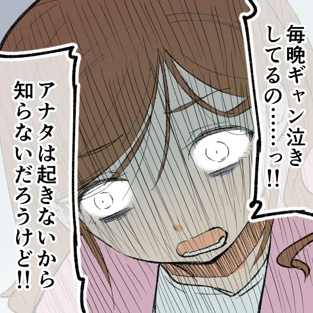 俺の言葉を聞いた瞬間、ゆきのは目をカッと見開き、「毎晩ギャン泣きしてるの・・・っ!アナタは起きないから知らないだろうけど!」と、強い口調で言い返してきました。