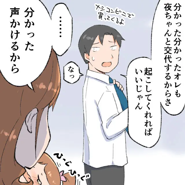 これが噂に聞く産後の情緒不安定ってやつか・・・。正直、面倒ごとにしたくなかった俺は、「わかったわかった、俺も夜ちゃんと交代するからさ、起こしてくれればいいじゃん」と話を終わらせました。ゆきのは納得したのかそれ以上は何も言わず、「・・・分かった、声かけるから」とだけ言いました。