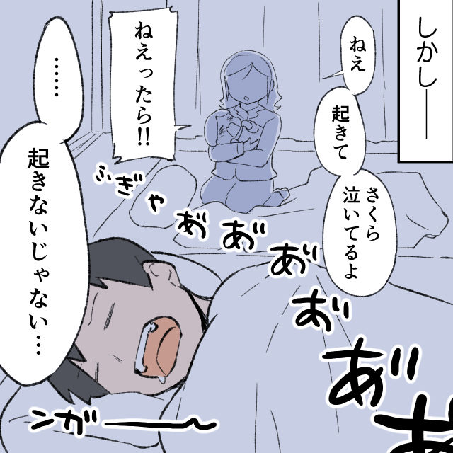 しかし、俺はまたしても熟睡してしまいました。さくらがギャン泣きしても、ゆきのに「起きて、さくら泣いてるよ」と声をかけられても、気持ち良さそうに夢の中。ゆきのの「・・・起きないじゃない」いうつぶやきは、さくらの泣き声と俺のいびきにかき消されてしまいました。