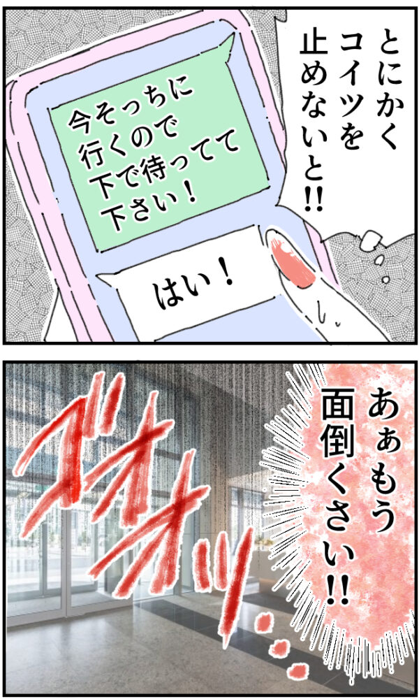 「今そっちに行くので下で待っててください!」白石さんはいちろうさんが上がって来ないように慌ててメッセージを送り、「あぁもう面倒くさい!!」と腹立たしく思いながら急いでいちろうさんのいる下へ向かいました。