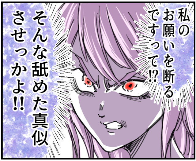 「私のお願いを断るですって!?そんな舐めた真似させっかよ!!」いちろうさんの方に向かう白石さんは今にも怒りが爆発しそうです。