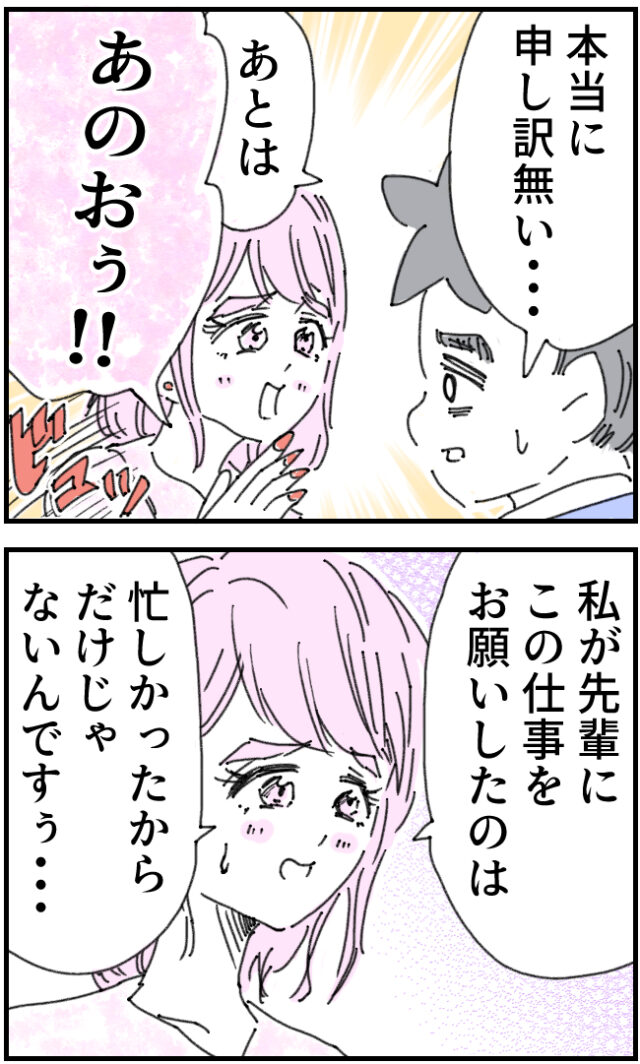 いちろうさんが「本当に申し訳ない・・・あとは」と言いかけると、「あのおぅ!!」と白石さんが遮り「私が先輩にこの仕事をお願いしたのは、忙しかったからだけじゃないんですぅ・・・」と話し始めました。