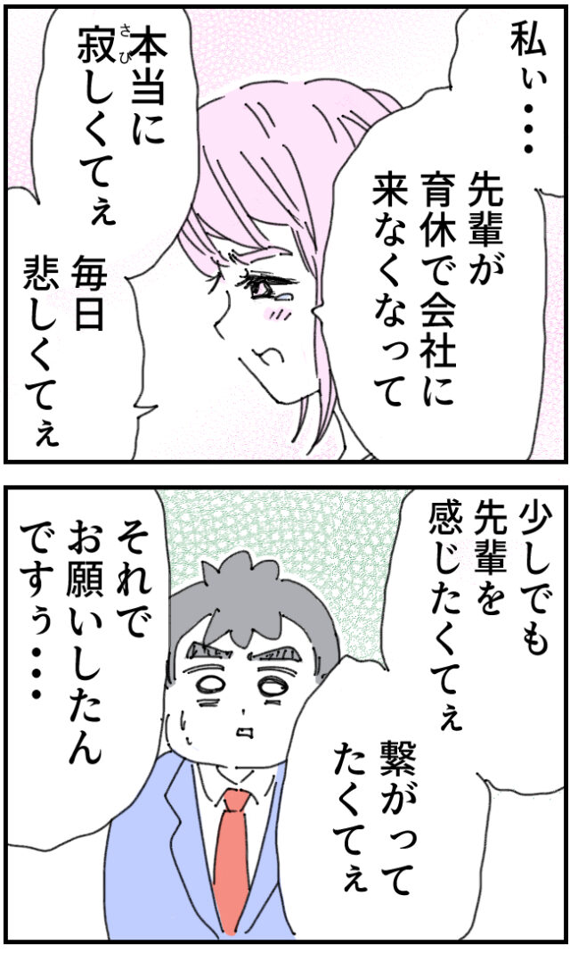 「私ぃ・・・先輩が育休で会社に来なくなって本当に寂しくてぇ、毎日悲しくてぇ。少しでも先輩を感じたくてぇ、繋がってたくてぇ、それでお願いしたんですぅ」いちろうさんに仕事を頼んだのは寂しかったからだと涙ながらに訴える白石さん。