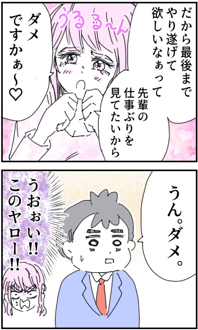 「だから最後までやり遂げて欲しいなぁって。先輩の仕事ぶりを見てたいから。ダメですかぁ~?」目をうるませ甘えた口調でいちろうさんに懇願する白石さん。しかし、いちろうさんは「うん。ダメ」とバッサリ。まさか自分の泣き落としが通用しないとは思っていなかった白石さんは「うおぉい!!このヤロー!!」と心の中でブチギレます。