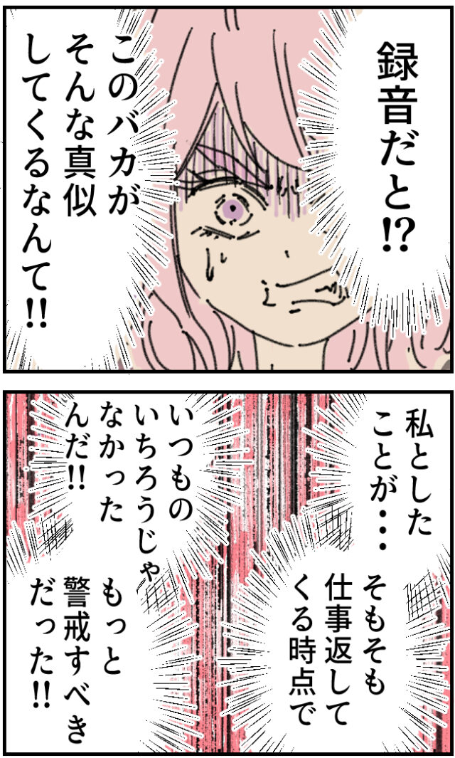 (録音だと!?このバカがそんな真似してくるなんて!!私としたことが・・・そもそも仕事返してくる時点でいつものいちろうじゃなかったんだ!!もっと警戒すべきだった!!)鬼のような形相の白石さんは、心の中でそんなことを考えていました。