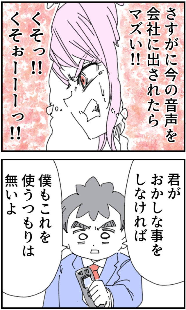 (さすがに今の音声を会社に出されたらマズイ!!くそっ!!くそぉーっ!!)そう思いながら黙っている白石さんに、「君がおかしな事をしなければ、僕もこれを使うつもりはないよ。」といちろうさんは言いました。