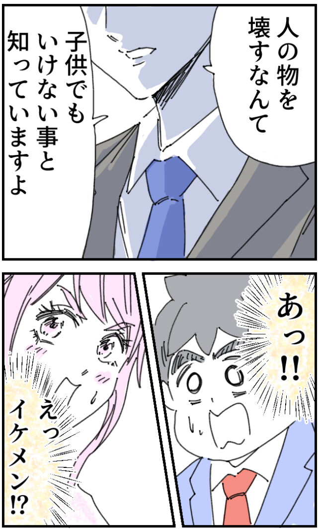 「人の物を壊すなんて、子供でもいけない事と知っていますよ」そう言った男性の顔を見たいちろうさんと白石さん。いちろうさんは「あっ!!」と驚き、白石さんは男性がイケメンであることに気づきハッとします。