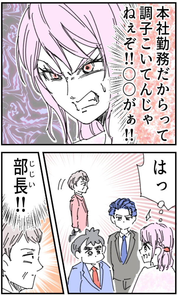 ついさっきまではイケメンでエリートの佐山さんに気に入られようと必死だった白石さんですが、「本社勤務だからって調子こいてんじゃねぇぞ!!」とブチギレ。すると、そこへたまたま白石さんの便利君の一人である部長が通りかかりました。
