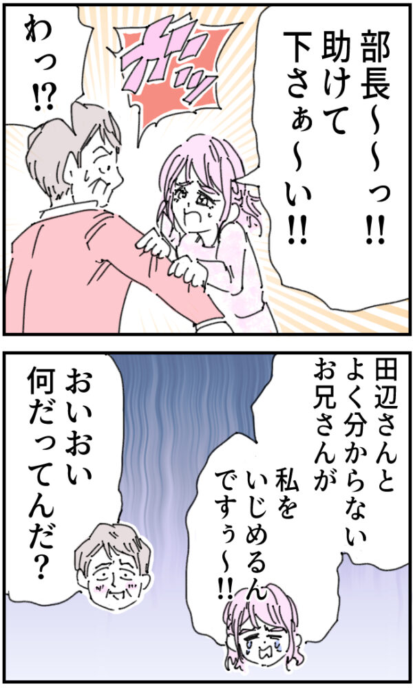 白石さんはすかさず「部長~~っ!!助けて下さぁ~い!!」と泣き真似をしながら部長の腕にしがみつき「田辺さんとよく分からないお兄さんが私をいじめるんですぅ~!!」と助けを求めます。