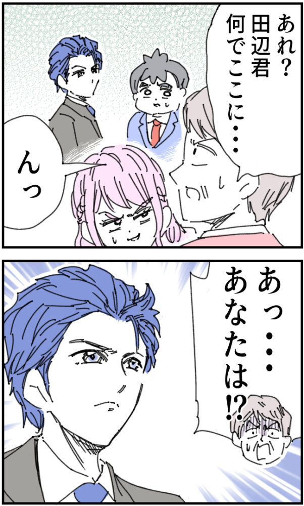 部長は育休中のいちろうさんが会社にいることに驚きつつ、隣にいる佐山さんに目を向けると「あっ・・・あなたは!?」と驚きの声を上げます。