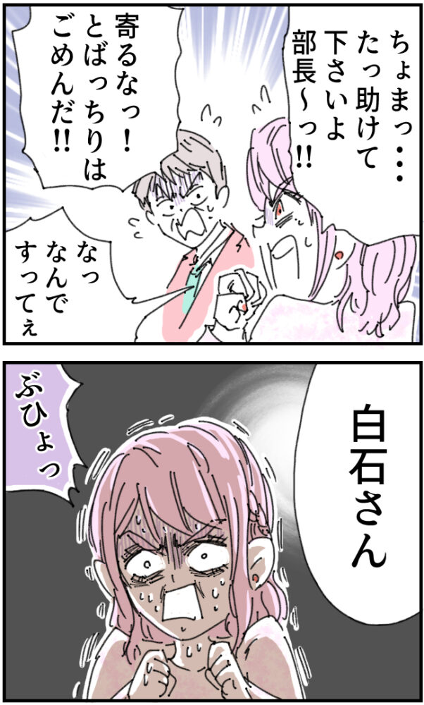 そそくさと立ち去ろうとする部長に「ちょ、まっ・・・助けて下さいよ部長~っ!!」と引き留めようとする白石さんですが、「寄るなっ!とばっちりはごめんだ!!」と言って行ってしまいました。部長に見捨てられた白石さんに、佐山さんが声をかけます。