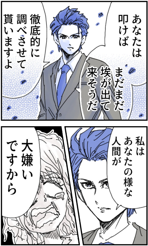 「あなたは叩けばまだまだ埃が出て来そうだ。徹底的に調べさせて貰いますよ。私はあなたのような人間が大嫌いですから」社長の息子である佐山さんに凄まれ、白石さんは青ざめます。
