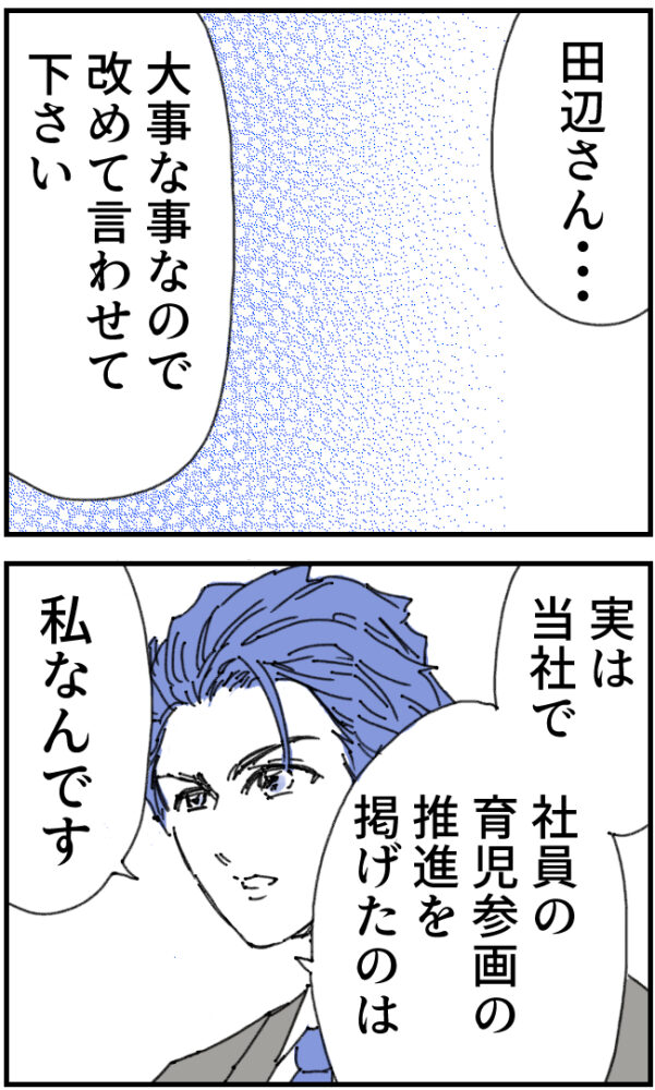 すると佐山さんは、「大事な事なので改めて言わせて下さい」と言って真剣な表情で話し始めます。「実は、当社で社員の育児参画の推進を掲げたのは私なんです」