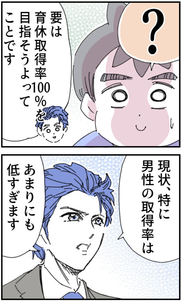 佐山さんの言葉の意味がわからずキョトンとするいちろうさんに、佐山さんは「要は育休取得率100%を目指そうよってことです」とわかりやすく伝え、現状の男性社員の育休取得率が低すぎると話します。