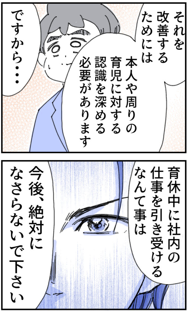 「それを改善するためには本人や周りの育児に対する認識を深める必要があります」と話す佐山さんの言葉を神妙な面持ちで聞くいちろうさん。そして、佐山さんは「育休中に社内の仕事を引き受けるなんて事は、今後、絶対になさらないで下さい」といちろうさんに念を押して強く言いました。