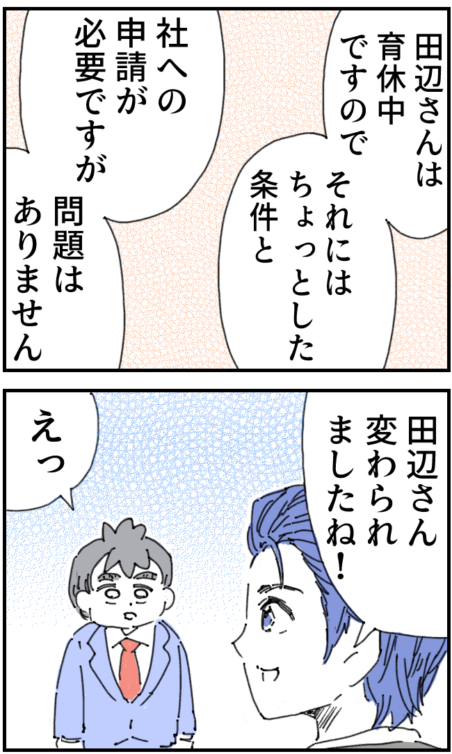 「田辺さんは育休中ですので、それにはちょっとした条件と、社への申請が必要ですが、問題はありません」そう答えた後で「田辺さん、変わられましたね!」と言う佐山さん、その言葉を聞いて「えっ」いちろうさんは驚きました。